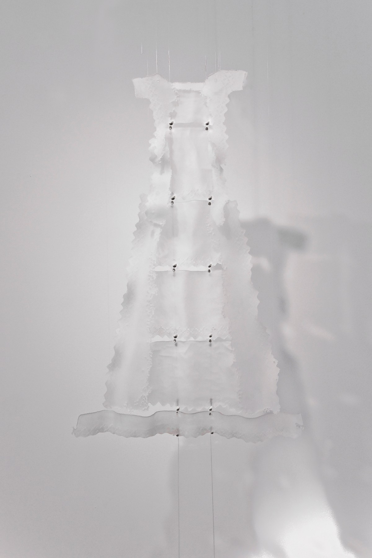 Suspended glass installation comprising of pate de verre elements, sand carved and slumped glass sheet Dimensions: h120 x w90 x d15 cm Date: 2009 This piece is based on a Christening Robe that has been in my family for over a 100 years. During the years I was christening my children it hung in my room. It made me think about my ties to…
